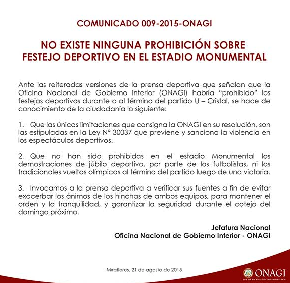 A través de un comunicado, la Oficina Nacional de Gobierno Interior (ONAGI) desmintió que haya prohibido que la gente de Sporting Cristal dé la vuelta olímpica en el Monumental en caso gane el Torneo Apertura.