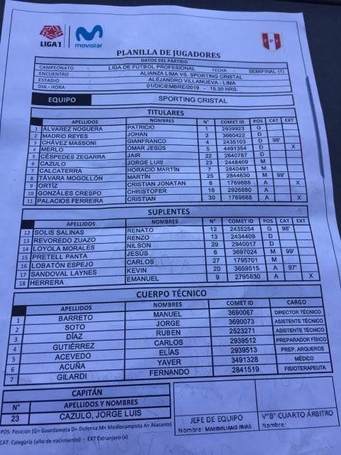 Sporting Cristal: Patricio Álvarez; Johan Madrid, Gianfranco Chávez, Omar Merlo, Jair Céspedes; Jorge Cazulo, Horacio Calcaterra, Martín Távara, Cristian Ortiz; Christofer Gonzales y Cristian Palacios.